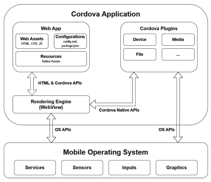 作成した「Web APP」を、各プラットフォーム(iOS, Androidなど)専用のラッパーアプリの中にある「WebView」で実行し、共通のAPI(Cordova Native APIs)を通じて本来ウェブページからはアクセスしにくいデバイス固有の機能(カメラ、GPS、連絡先など)をCordova Pluginsを使用することで利用できるようにすることができます。