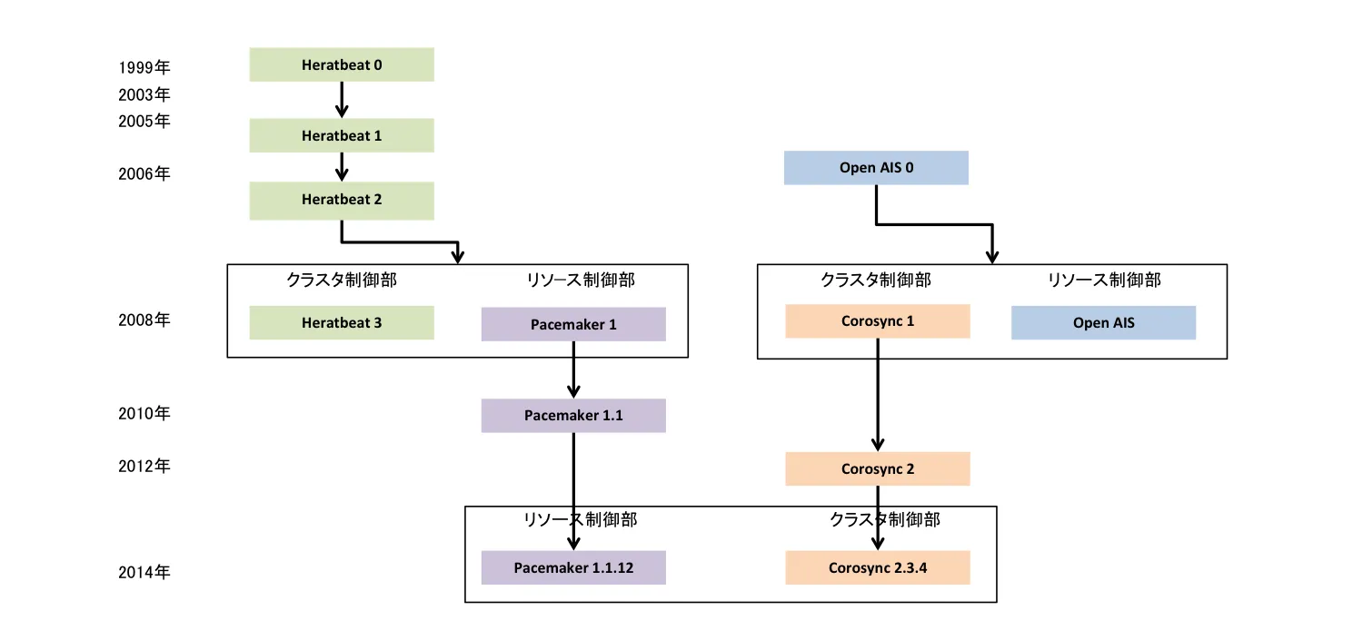 一方でクラスタソフトウェアとして有名なHeartbeatは2008年にクラスタ制御部:Heartbeat、リソース制御部:Pacemakerに分離されています。