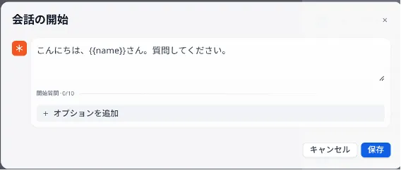 ここで「機能」ボタンを押し、機能から「会話の開始」をオンにしてオープナーメッセージを開きます。