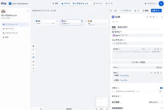 WebUI上のビジュアルワークフローが用意され、ノーコード/ローコードでAIアプリケーションを開発できます。