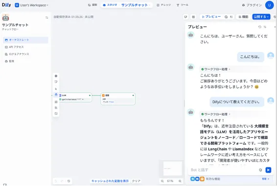 Dify(ディフィ)は、既存の大規模言語モデルに基づいたオープンソースのAIアプリ開発プラットフォームであり、ユーザが独自のチャットボットやAIアシスタント、ナレッジベースを簡単に作成・運用できる環境を提供しています。