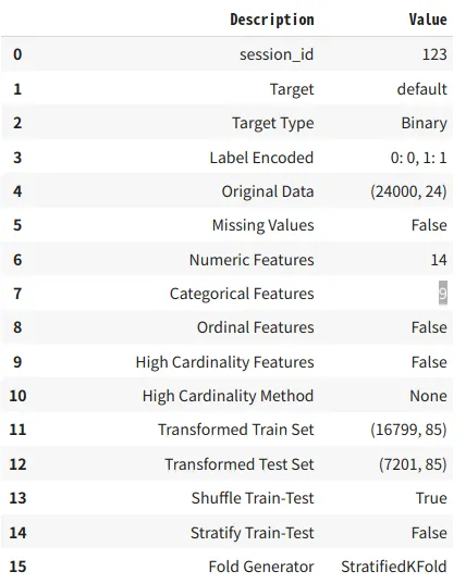 setup(data = data, target = 'default', session_id=123)