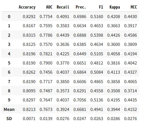 この関数は、ランダムグリッドサーチを使用してモデルのハイパーパラメーターを自動的に調整します。出力は、モデルの最高の精度、AUC、再現率、適合率、F1、kappa、およびMCCを出力します。