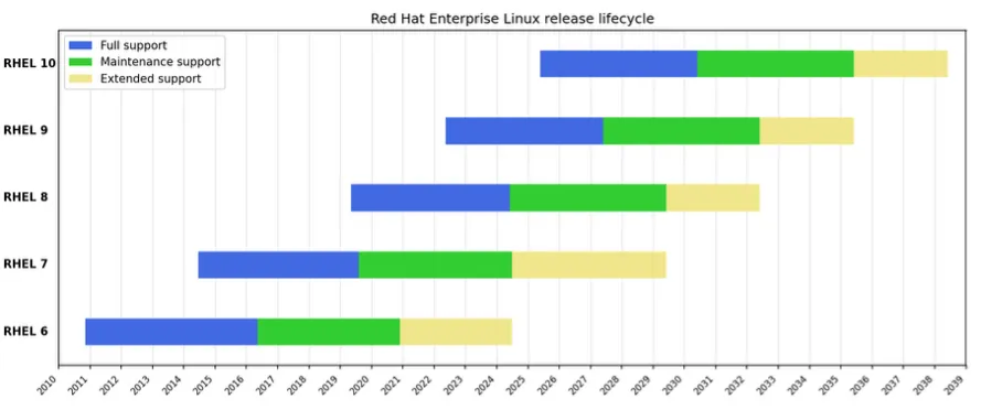 RHEL6からRHEL10までのライフサイクル図は以下の通りです。