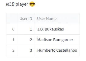 'User Name': ['J.B. Bukauskas','Madison Bumgarner','Humberto Castellanos']})