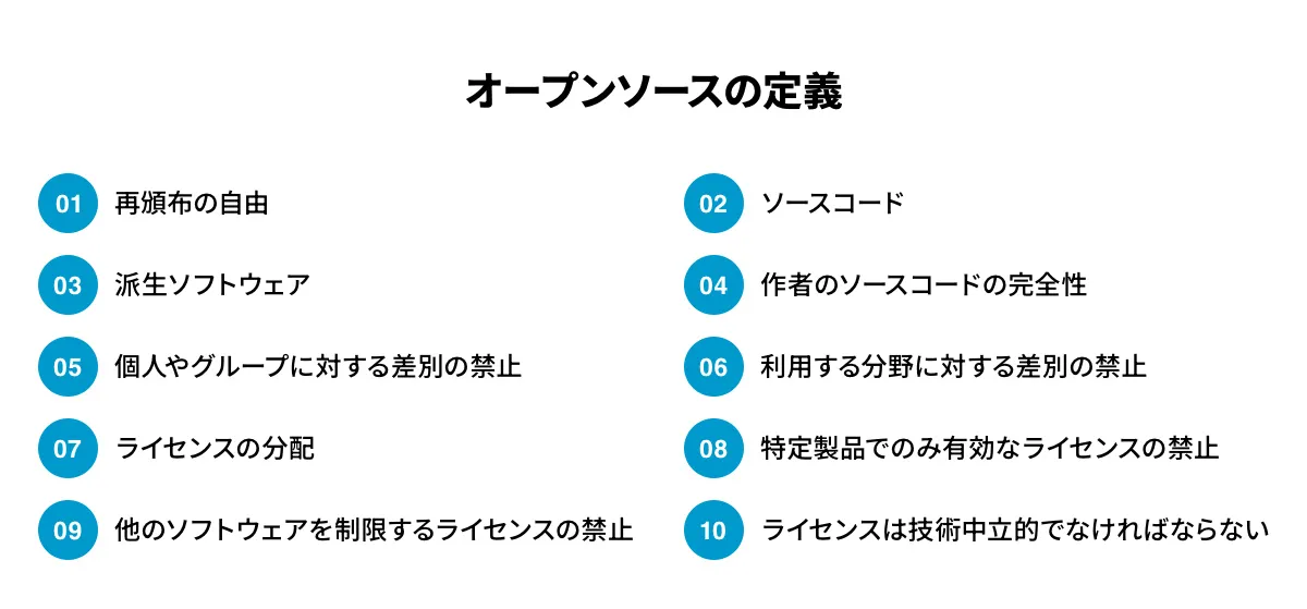 OSIが定めたオープンソースの定義は、以下に記載する10の条項からなります。