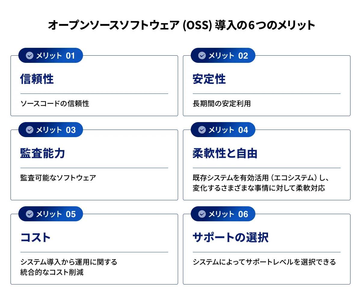 さらに、導入コストを抑えられるうえ、世界中の開発者が参加するコミュニティによる継続的なサポートを受けられる点も、OSSが選ばれる大きな要因です。OSSのメリットについては、次の章で解説します。
