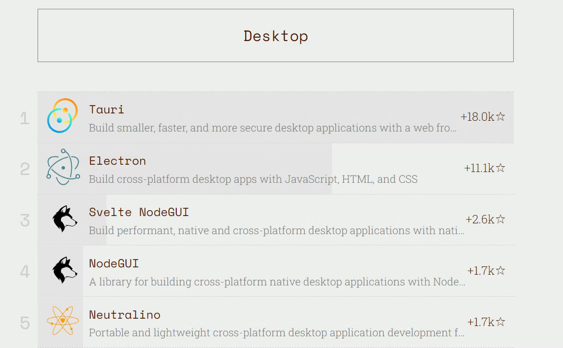 2021 JavaScript Rising Starsでは2022年12月現在、Desktop部門でElectronを抑えて1位になっています。