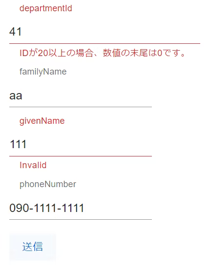 - ロジックによるチェックや、エラーメッセージのカスタマイズが必要な場合は手動で別のバリデーション定義を書く必要があります。
