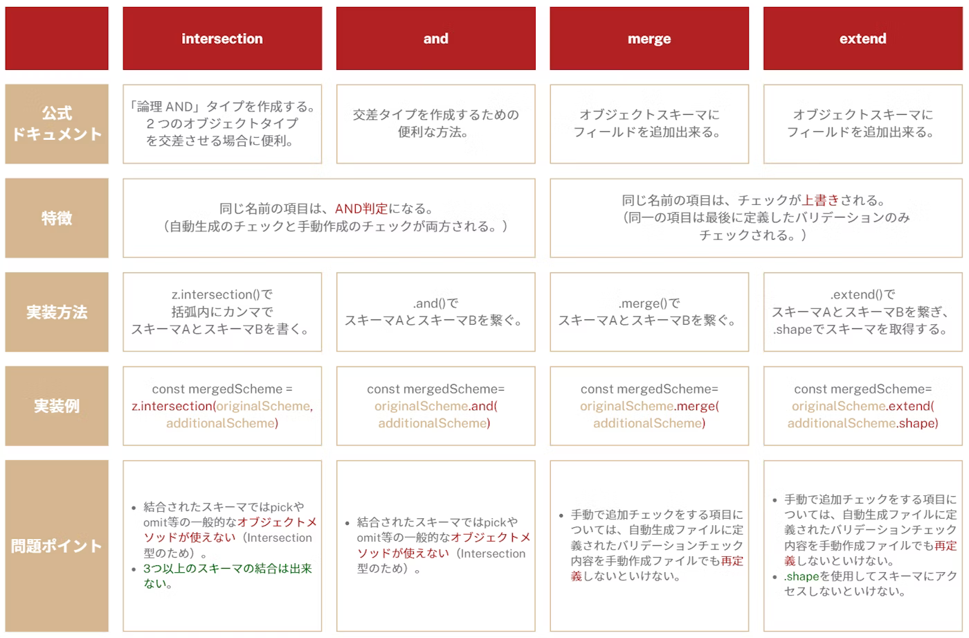 givenName項目に英文字以外の文字が入力されていてもエラーになっていないため、ManualDefinitionValidation2のチェックがされていないことが分かります。 .intersection()は3つ以上のスキーマの結合は出来ません。 また、mergedSampleSchemeの後ろに.pick()メソッドをつけるとIntersection型のため、pickやomitのようなメソッドが使用出来ないとも分かりました。