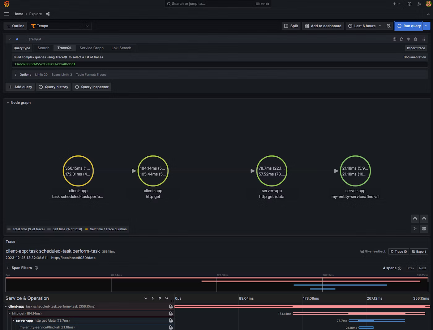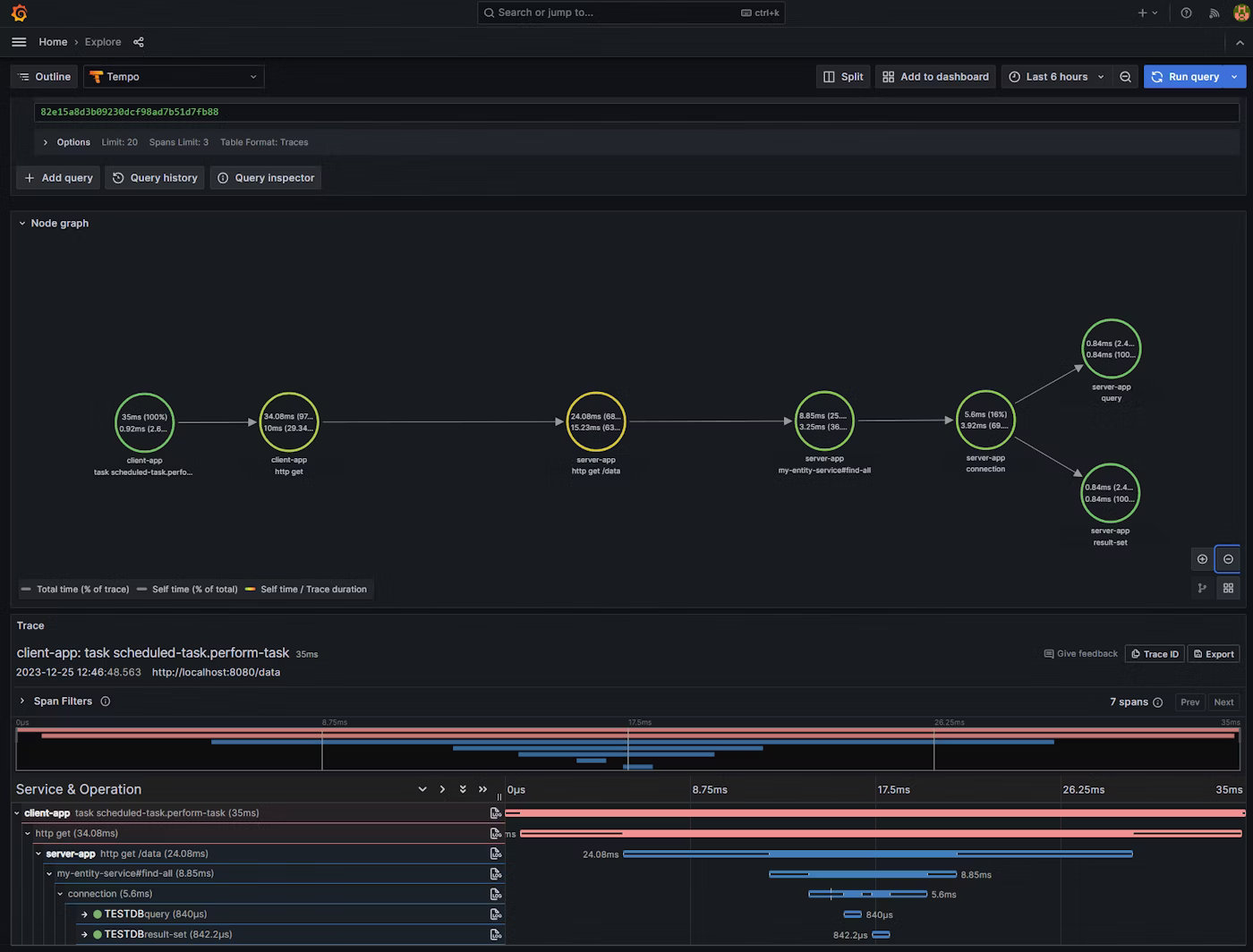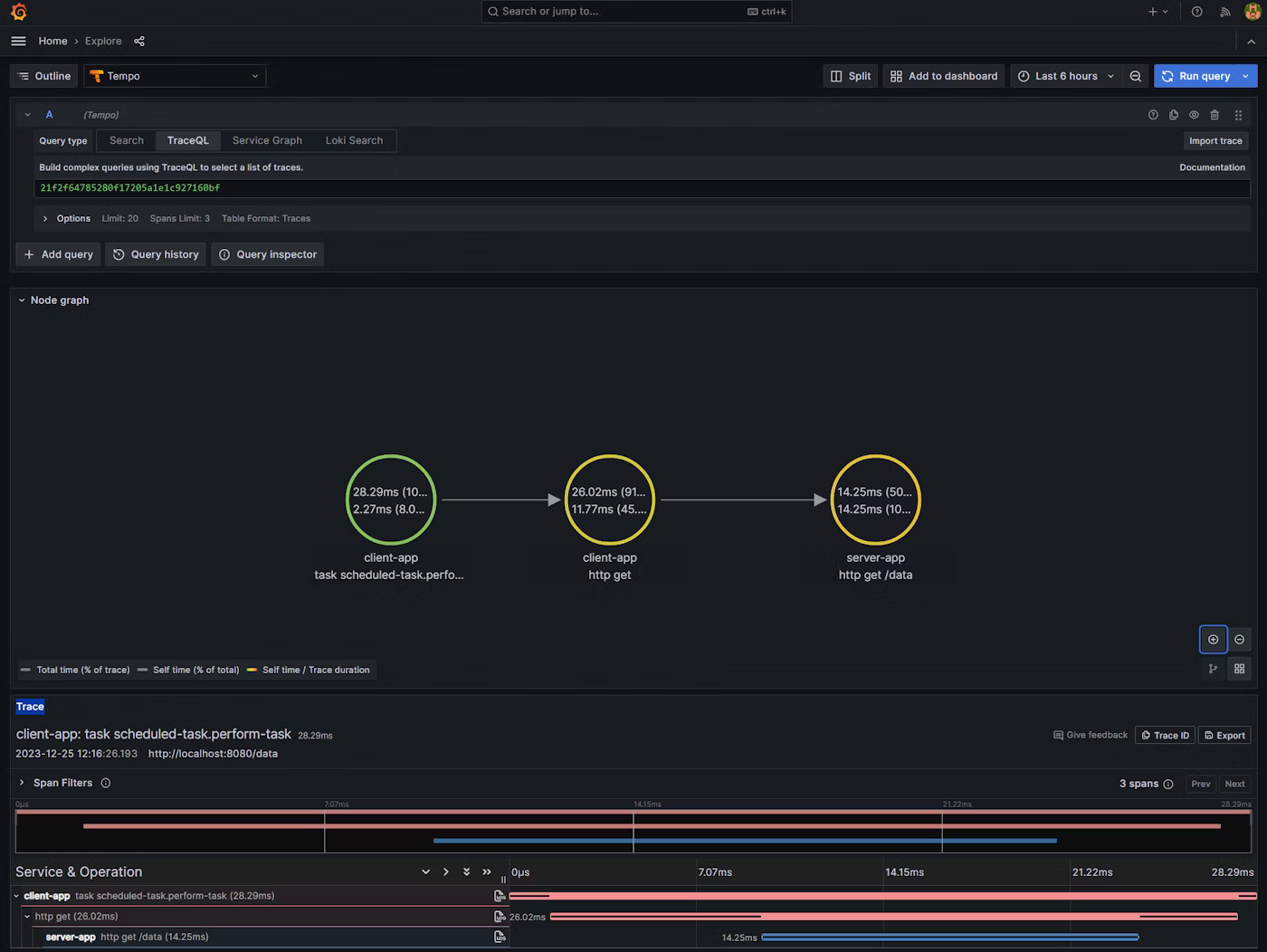 Grafanaのデータソースとして、Tempoを追加して可視化させます。Grafanaファミリーというだけあって、ダッシュボードを用意せずとも、Tempoに蓄積したトレース情報を可視化、分析するためのUIが提供されています。トレースIDを指定して絞り込むと以下のような結果を表示してくれます。