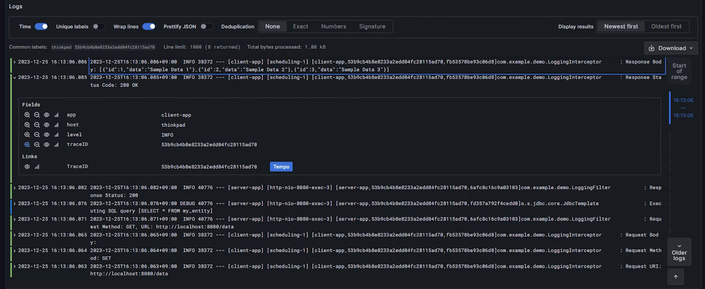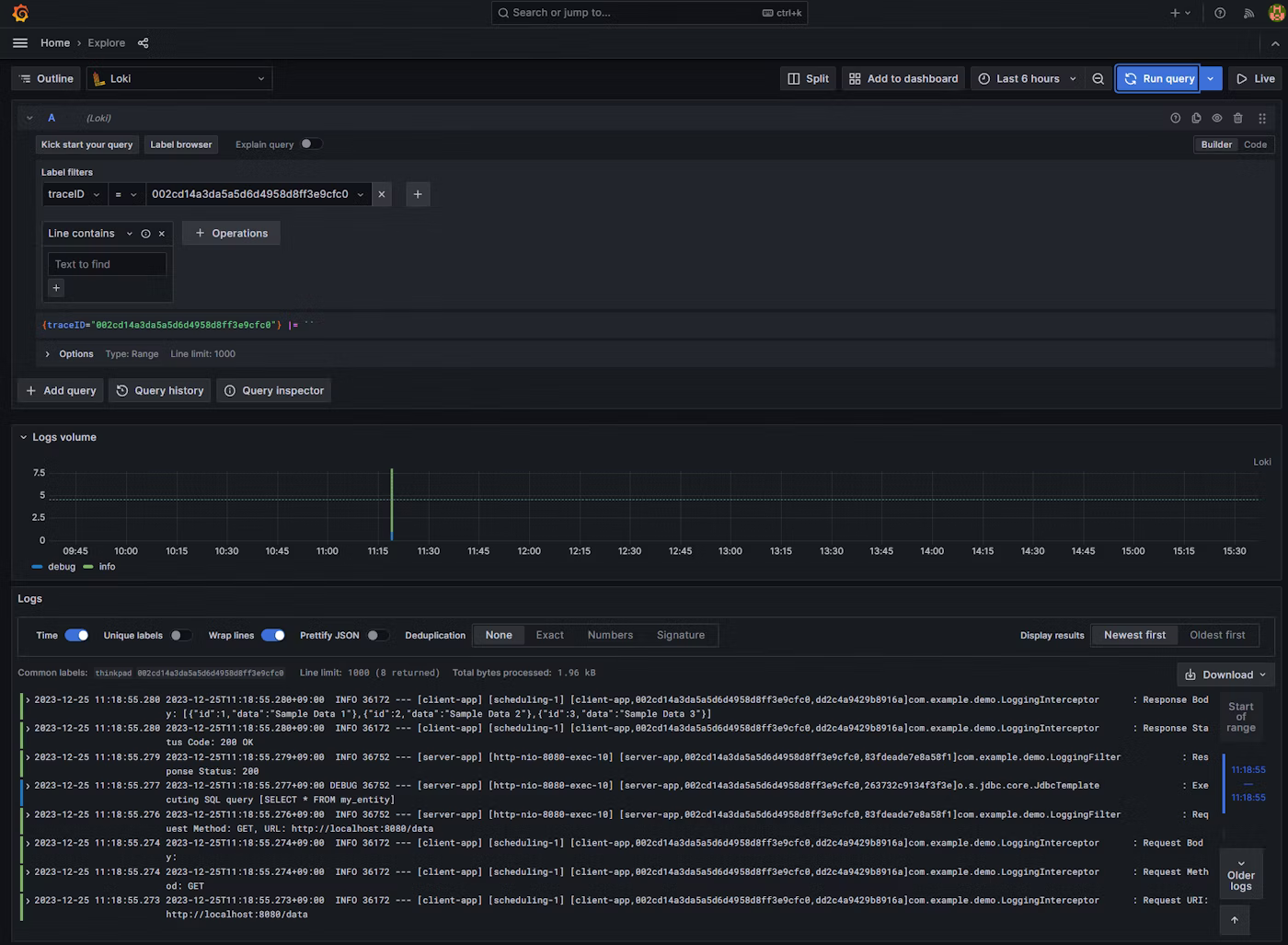 Grafanaのデータソースとして、Lokiを追加して可視化させます。Tempoと同様にダッシュボードを用意せずとも、Lokiに蓄積したログ情報を可視化、分析するためのUIが提供されています。appenderでセットしたキーであるtraceIDを指定して絞り込むと以下のような結果を表示してくれます。