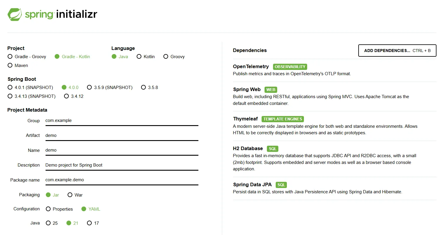 spring-boot-starter-opentelemetryはSpring Initializrで対応済みなので、簡単に雛形のアプリが作れそうです。