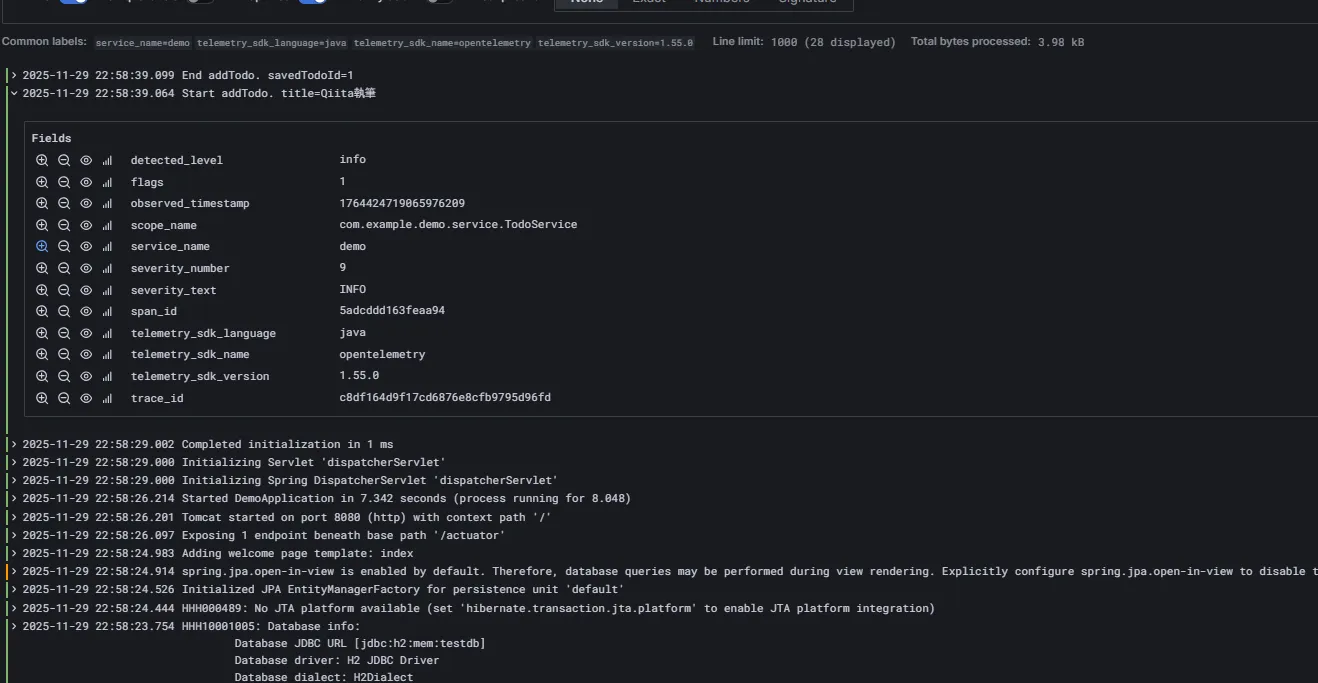 ログメッセージに加えて、いくつかのメタデータも送信されています。スパンIDやトレースIDも含まれていますので、Grafanaの設定を行うことでトレース⇔ログの連携もできるようになります。